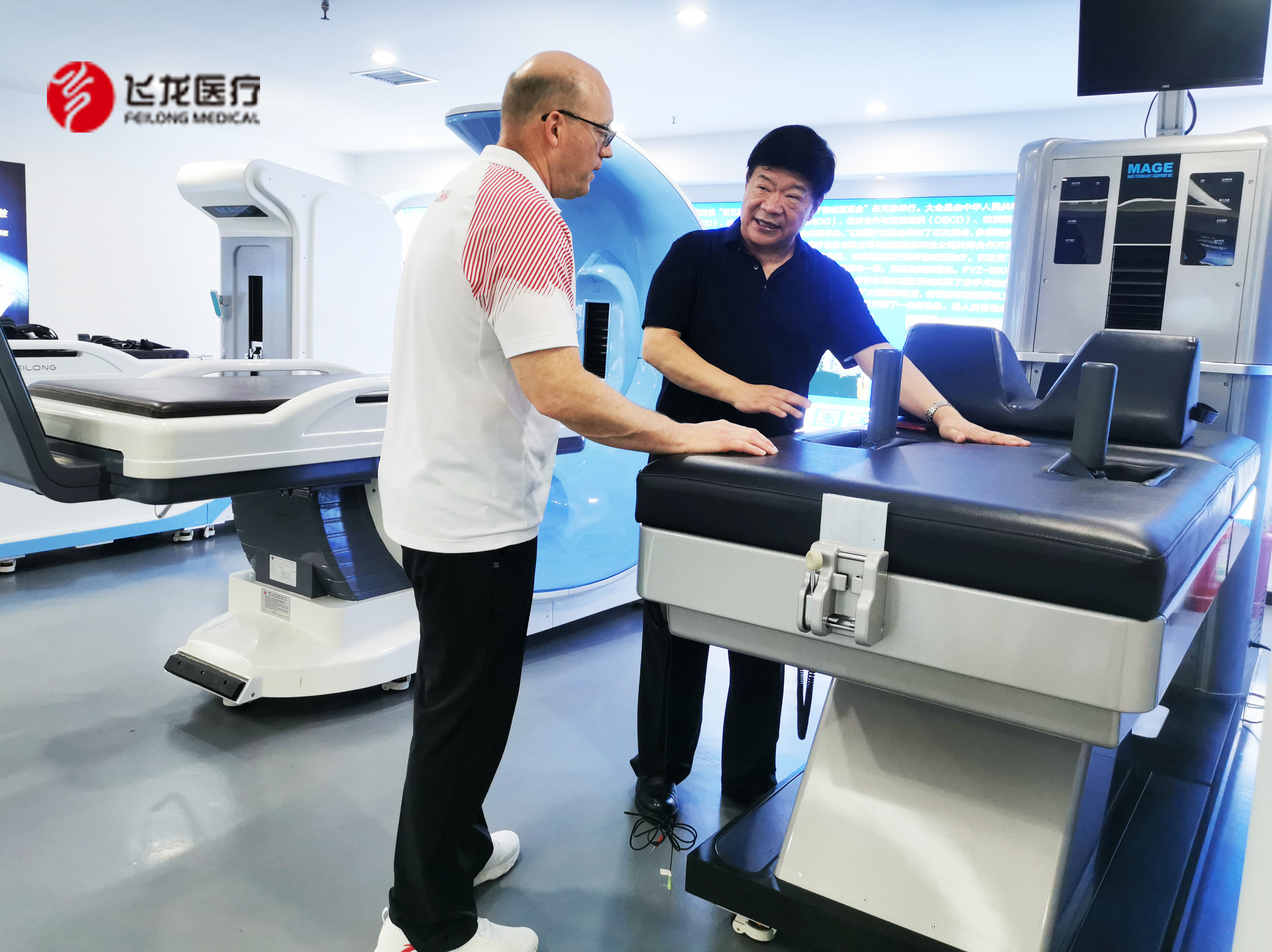 開(kāi)班儀式中,清華大學(xué)——生命大學(xué)脊骨神經(jīng)醫(yī)學(xué)研究中心、清華大學(xué)高級(jí)訪問(wèn)學(xué)者、美國(guó)著名的脊骨神經(jīng)醫(yī)學(xué)專家David Bellin教授對(duì)飛龍醫(yī)療外星艙系列產(chǎn)品非常感興趣,并在會(huì)議后主動(dòng)提出實(shí)地參觀飛龍醫(yī)療外星艙系列產(chǎn)品。