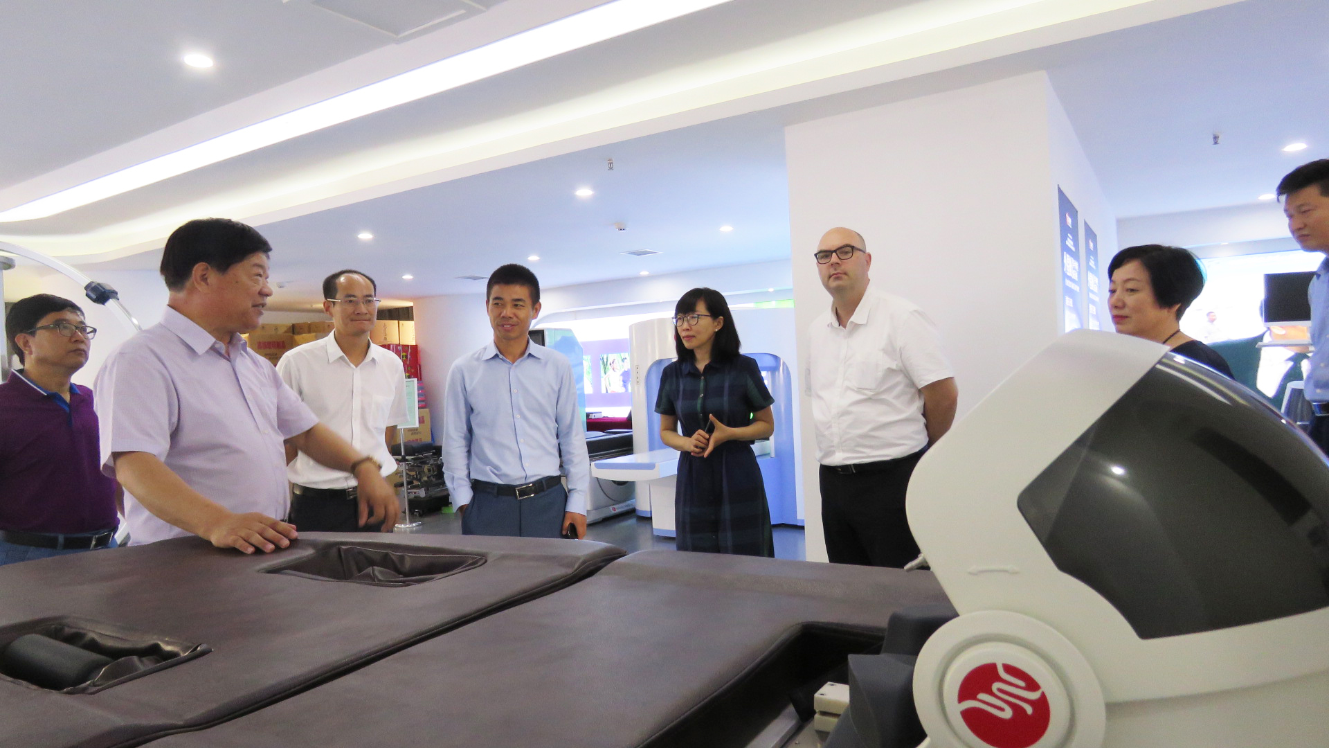 鄭州飛龍醫(yī)療設(shè)備有限公司董事長張新民帶領(lǐng)大家前往飛龍醫(yī)療產(chǎn)品展廳進(jìn)行參觀,他向來賓詳細(xì)介紹了飛龍醫(yī)療的外星艙非手術(shù)脊柱減壓系統(tǒng)、外星艙頸椎定位周期牽引系統(tǒng)等高端康復(fù)設(shè)備,以及自主研發(fā)生產(chǎn)的艱辛歷程,促進(jìn)了彼此的深入了解。